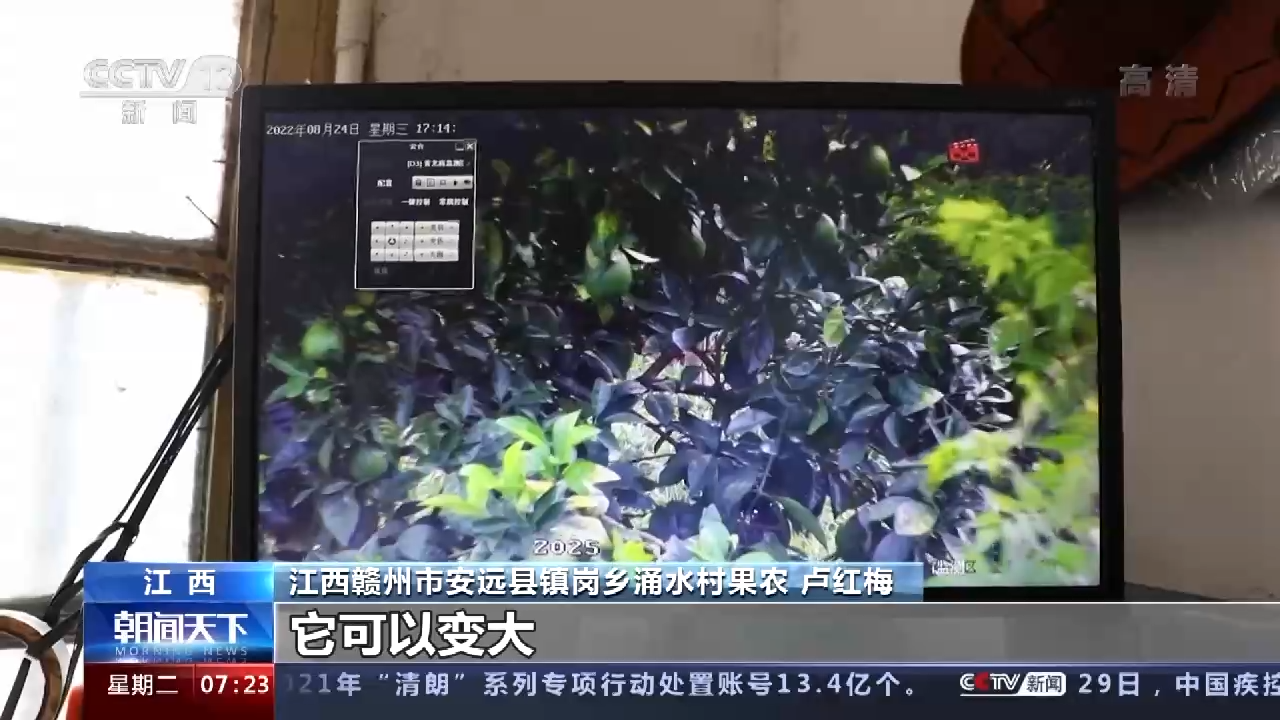 江西赣州市安远县镇岗乡涌水村果农 卢红梅:温度,土壤的湿度,还有降雨量,它都从数据上体现出来,通过这些数据我们就可以预判出最近可能会发生的一些病虫害。比如我们打开这个区域,把它点开,它可以变大,很清楚地可以看到这些叶子、果子的长势。