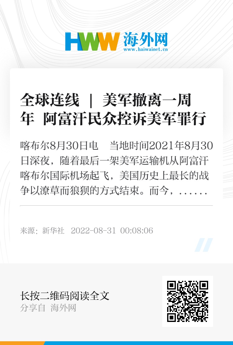 新华社喀布尔8月30日电 当地时间2021年8月30日深夜,随着最后一架美军运输机从阿富汗喀布尔国际机场起飞,美国历史上最长的战争以潦草而狼狈的方式结束。而今,美国撤军已过去一年,美军在此犯下的罪行却依旧如噩梦般萦绕在阿富汗民众的心头。
