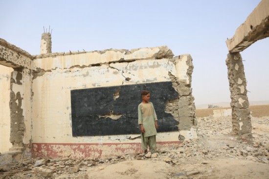 8月23日,在阿富汗南部赫尔曼德省桑金地区,一名男孩站在废墟之中。新华社发(塞夫拉赫曼・萨菲摄)