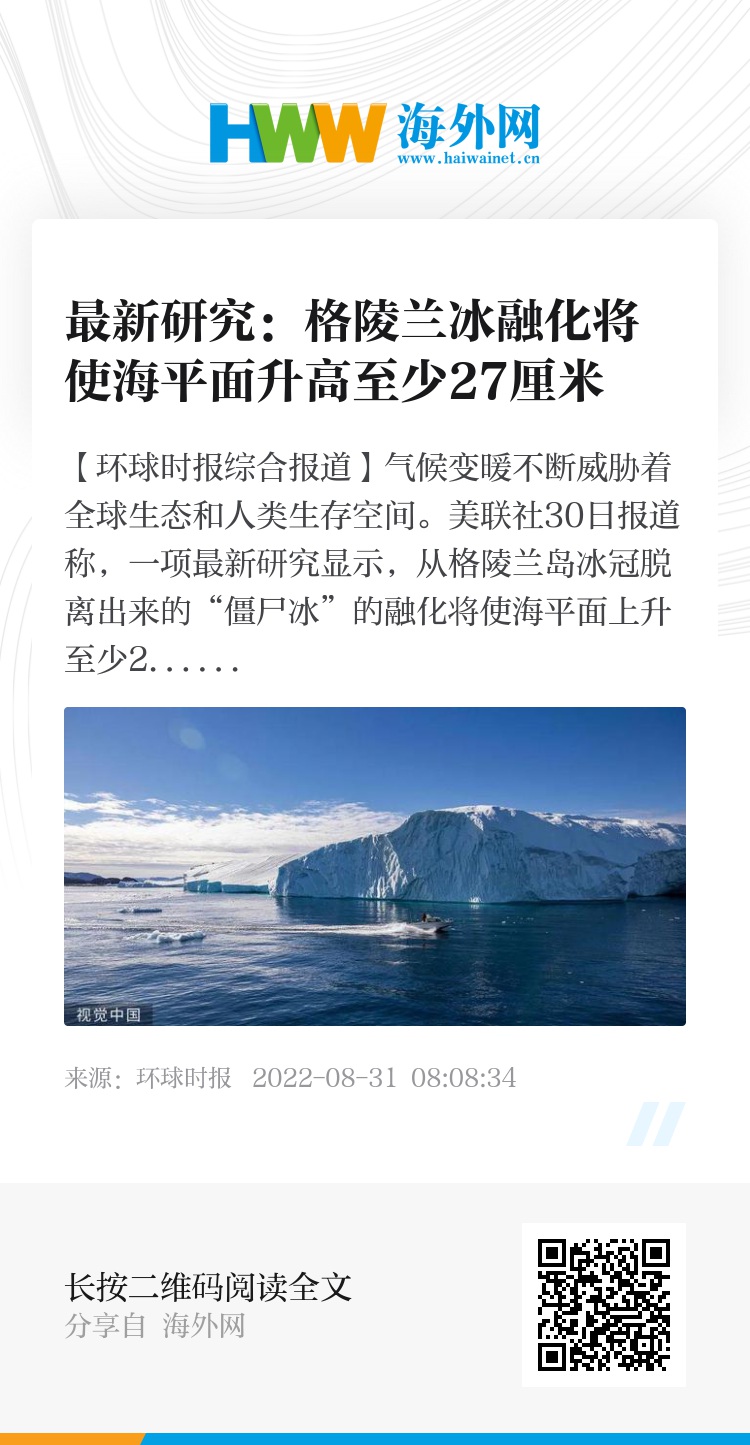 【环球时报综合报道】气候变暖不断威胁着全球生态和人类生存空间。美联社30日报道称,一项最新研究显示,从格陵兰岛冰冠脱离出来的“僵尸冰”的融化将使海平面上升至少27厘米,最终导致孟加拉国、纽约、迈阿密等国家和地区消失。