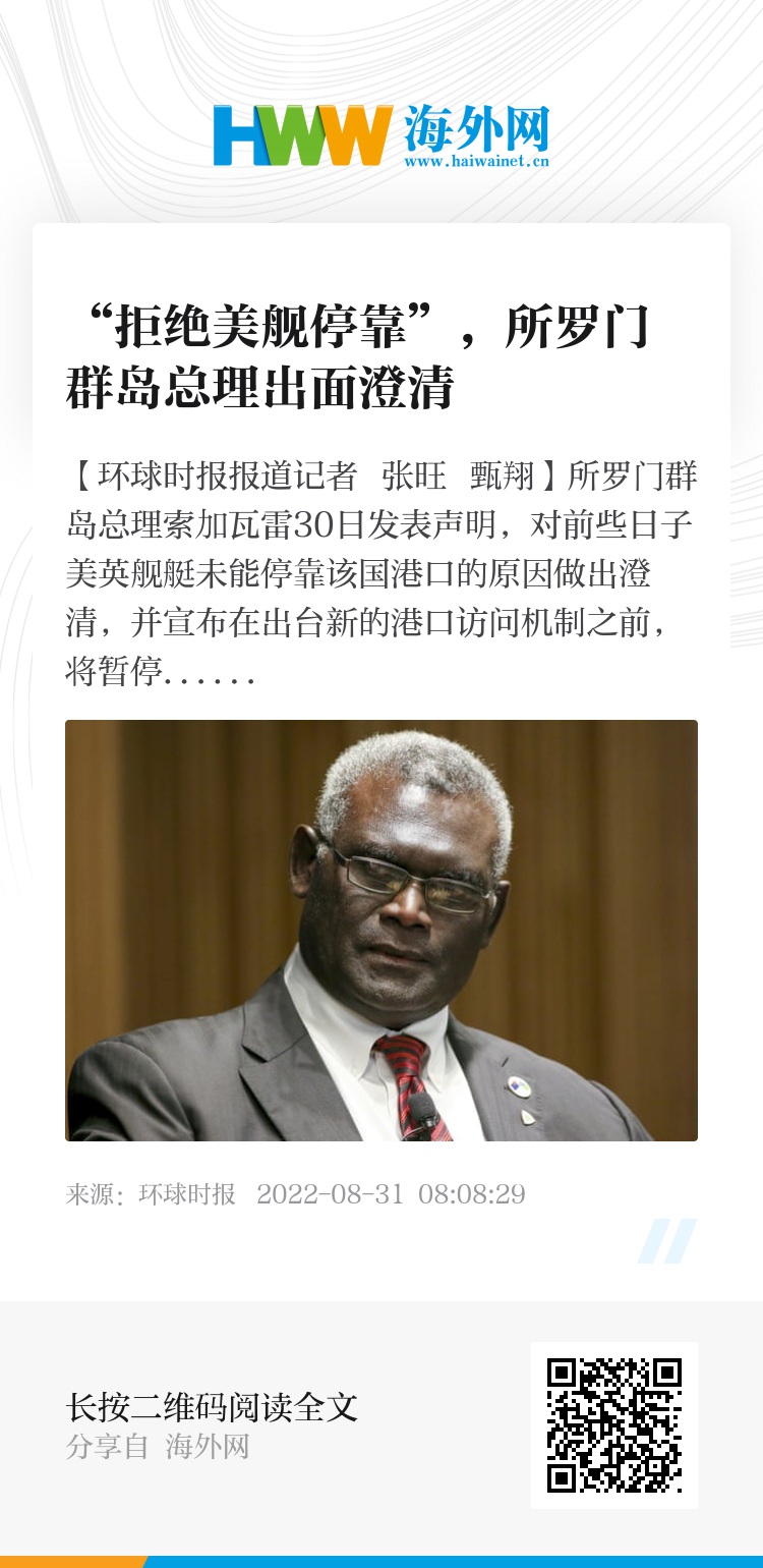 【环球时报报道记者 张旺 甄翔】所罗门群岛总理索加瓦雷30日发表声明,对前些日子美英舰艇未能停靠该国港口的原因做出澄清,并宣布在出台新的港口访问机制之前,将暂停接待所有外国军舰停靠。不过,所总理化解问题的举动,却成为西方媒体继续炒作“中国威胁”的契机。