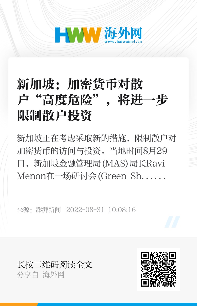 Menon表示,这似乎是一个全球现象,不仅仅发生在新加坡。“许多散户不理智地忽视了加密货币交易的风险。与投资散户相关的风险已经引起了世界各地监管机构的注意。因此,MAS正在考虑采取进一步的措施以保护散户。这些措施可能包括客户适用性测试,以及限制在加密货币交易时使用杠杆和信贷工具。”(记者 王蕙蓉)