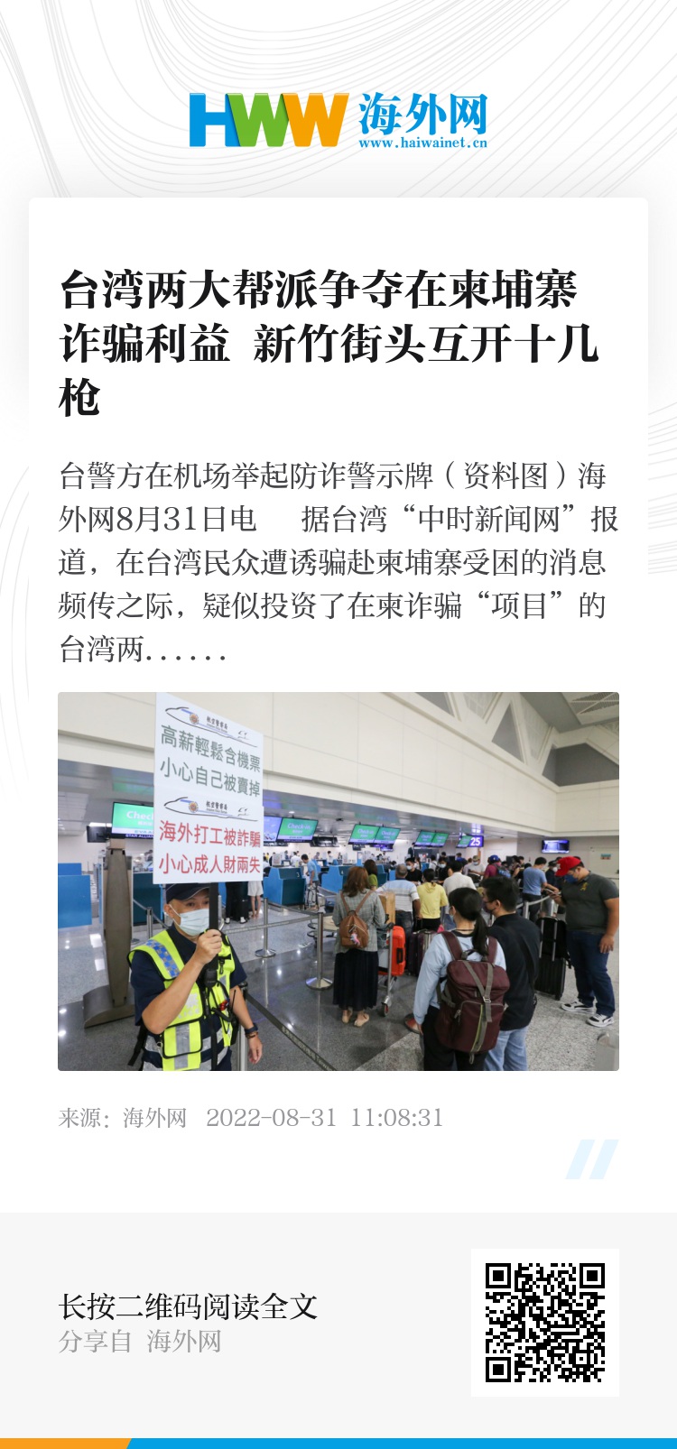 海外网8月31日电 据台湾“中时新闻网”报道,在台湾民众遭诱骗赴柬埔寨受困的消息频传之际,疑似投资了在柬诈骗“项目”的台湾两大帮派,竟为了争夺利益爆发冲突。双方人员30日在新竹火拼,互开十几枪。