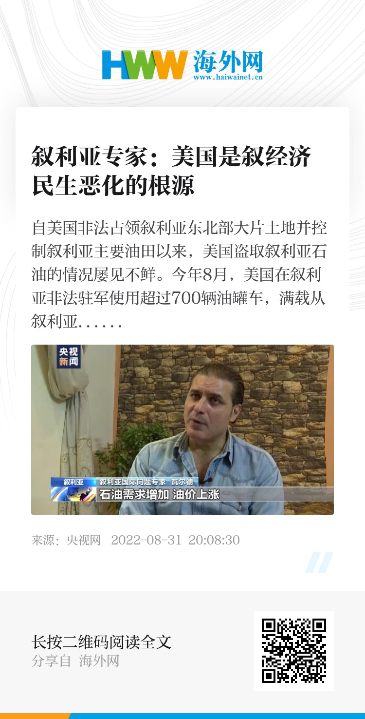 叙利亚国际问题专家 瓦尔德:石油需求增加、油价上涨,全球都出现了能源短缺现象,所以美国及其代理人增加了掠夺盗采叙利亚石油的频率。