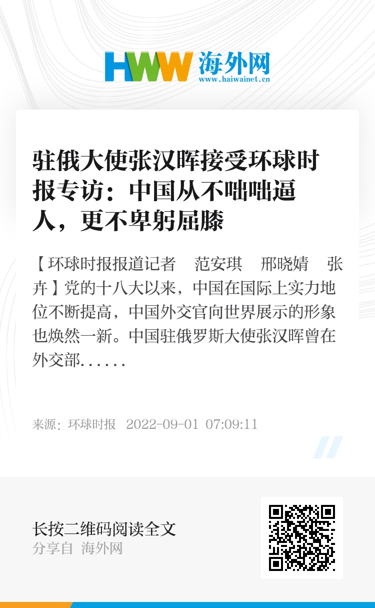 【环球时报报道记者 范安琪 邢晓婧 张 卉】党的十八大以来,中国在国际上实力地位不断提高,中国外交官向世界展示的形象也焕然一新。中国驻俄罗斯大使张汉晖曾在外交部欧亚司、中国驻吉尔吉斯共和国以及乌克兰大使馆工作,也曾担任中国驻哈萨克斯坦大使。他日前在接受《环球时报》记者独家专访时介绍了自己在外交工作中感受到的中国国力变化,以及其他国家对中国哪些方面最感兴趣,“我们的工作不仅要答疑解惑、增信明理,还要贡献中国智慧,提供中国方案,同世界各国一道,实现共同发展”。