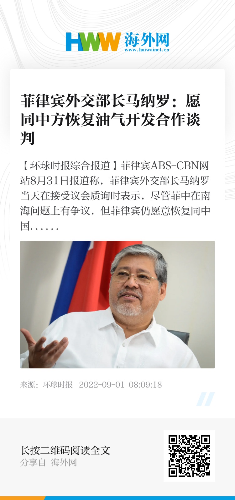 【环球时报综合报道】菲律宾ABS-CBN网站8月31日报道称,菲律宾外交部长马纳罗当天在接受议会质询时表示,尽管菲中在南海问题上有争议,但菲律宾仍愿意恢复同中国在南海的石油和天然气勘探谈判。