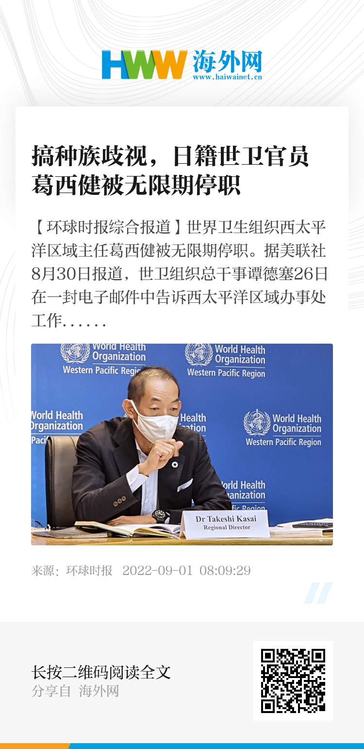 【环球时报综合报道】世界卫生组织西太平洋区域主任葛西健被无限期停职。据美联社8月30日报道,世卫组织总干事谭德塞26日在一封电子邮件中告诉西太平洋区域办事处工作人员,葛西健正在“休假”,但没有进一步详细说明。