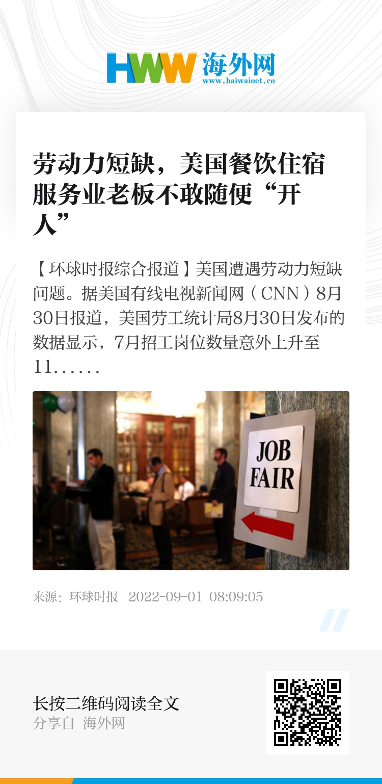 【环球时报综合报道】美国遭遇劳动力短缺问题。据美国有线电视新闻网(CNN)8月30日报道,美国劳工统计局8月30日发布的数据显示,7月招工岗位数量意外上升至1120万个,而此前预估数为1050万个。结合求职者人数,可以看出7月美国平均每个求职者对应2个可选的就业岗位,而6月每个求职者只能对应1.8个就业岗位。不同细分市场用工情况也不尽相同。餐饮住宿服务业用工情况持续紧张,分析人士指出,餐饮住宿服务业老板现在根本不敢因为员工服务不好、做错事而随意开除人,因为现在招人太难了,老员工走了就很难找到新人替代。