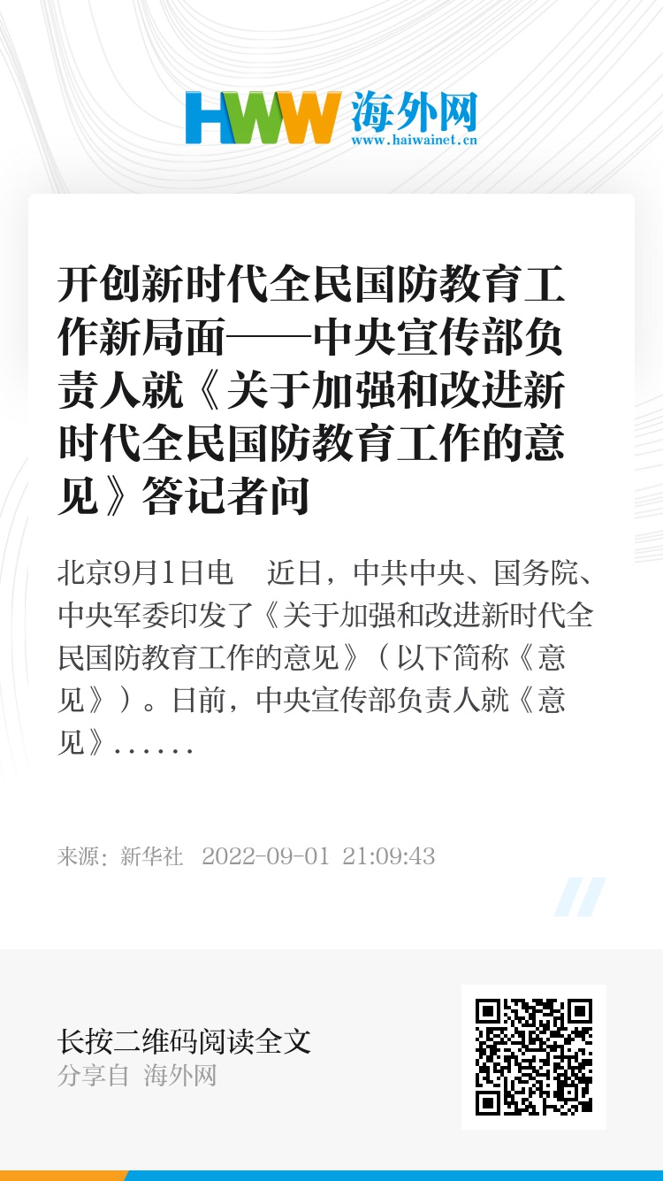 新华社北京9月1日电 近日,中共中央、国务院、中央军委印发了《关于加强和改进新时代全民国防教育工作的意见》(以下简称《意见》)。日前,中央宣传部负责人就《意见》有关情况,回答了记者的提问。