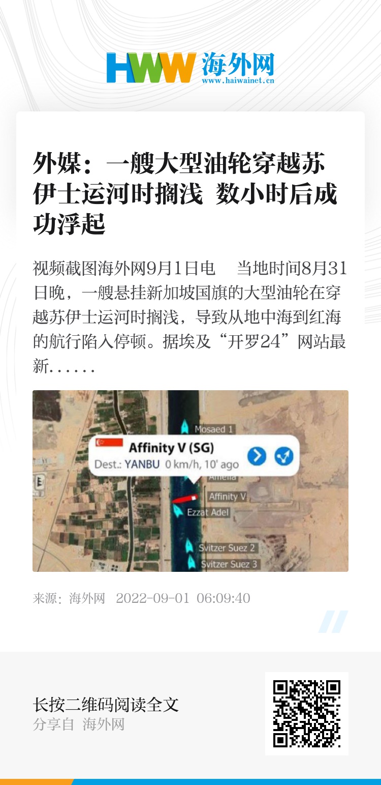 海外网9月1日电 当地时间8月31日晚,一艘悬挂新加坡国旗的大型油轮在穿越苏伊士运河时搁浅,导致从地中海到红海的航行陷入停顿。据埃及“开罗24”网站最新消息,苏伊士运河管理局发言人对媒体表示,经过多次尝试,该油轮在搁浅数小时后已经重新浮起。(海外网 张霓)