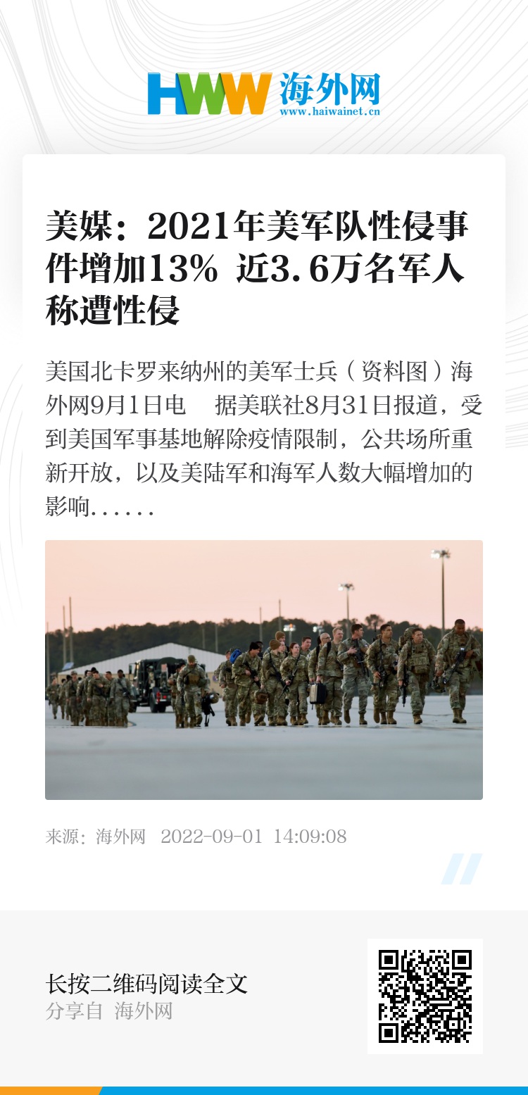 海外网9月1日电 据美联社8月31日报道,受到美国军事基地解除疫情限制,公共场所重新开放,以及美陆军和海军人数大幅增加的影响,2021年美国军队发生的性侵案件数量增加了13%,近3.6万名军人称曾遭遇性侵。