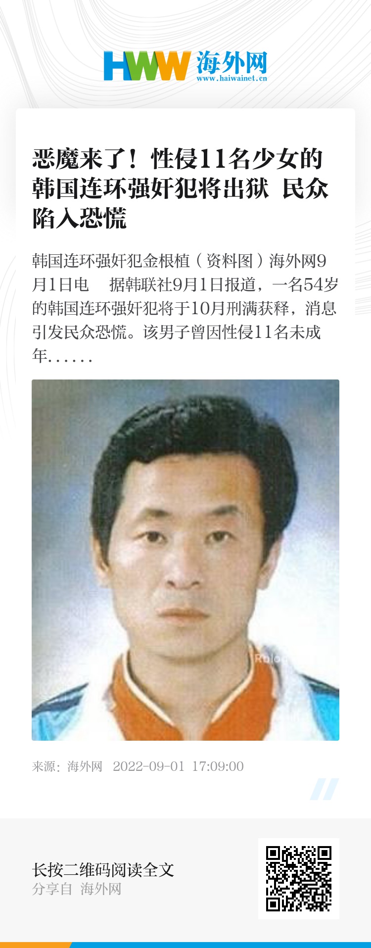 在此之前,金根植已有19起前科。2000年,他曾因强奸致伤罪被判处5年有期徒刑。然而,2006年出狱仅过16天,又再次作案。据悉,他因自卑难以与成年女性正常交往,便选择未成年人行凶。
