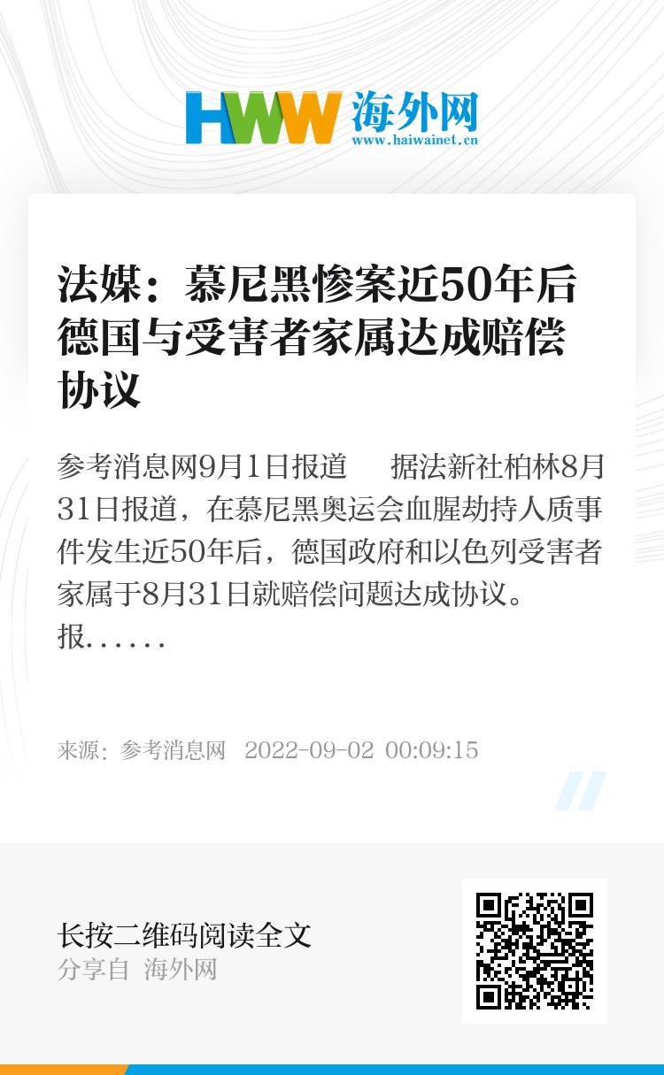 参考消息网9月1日报道 据法新社柏林8月31日报道,在慕尼黑奥运会血腥劫持人质事件发生近50年后,德国政府和以色列受害者家属于8月31日就赔偿问题达成协议。