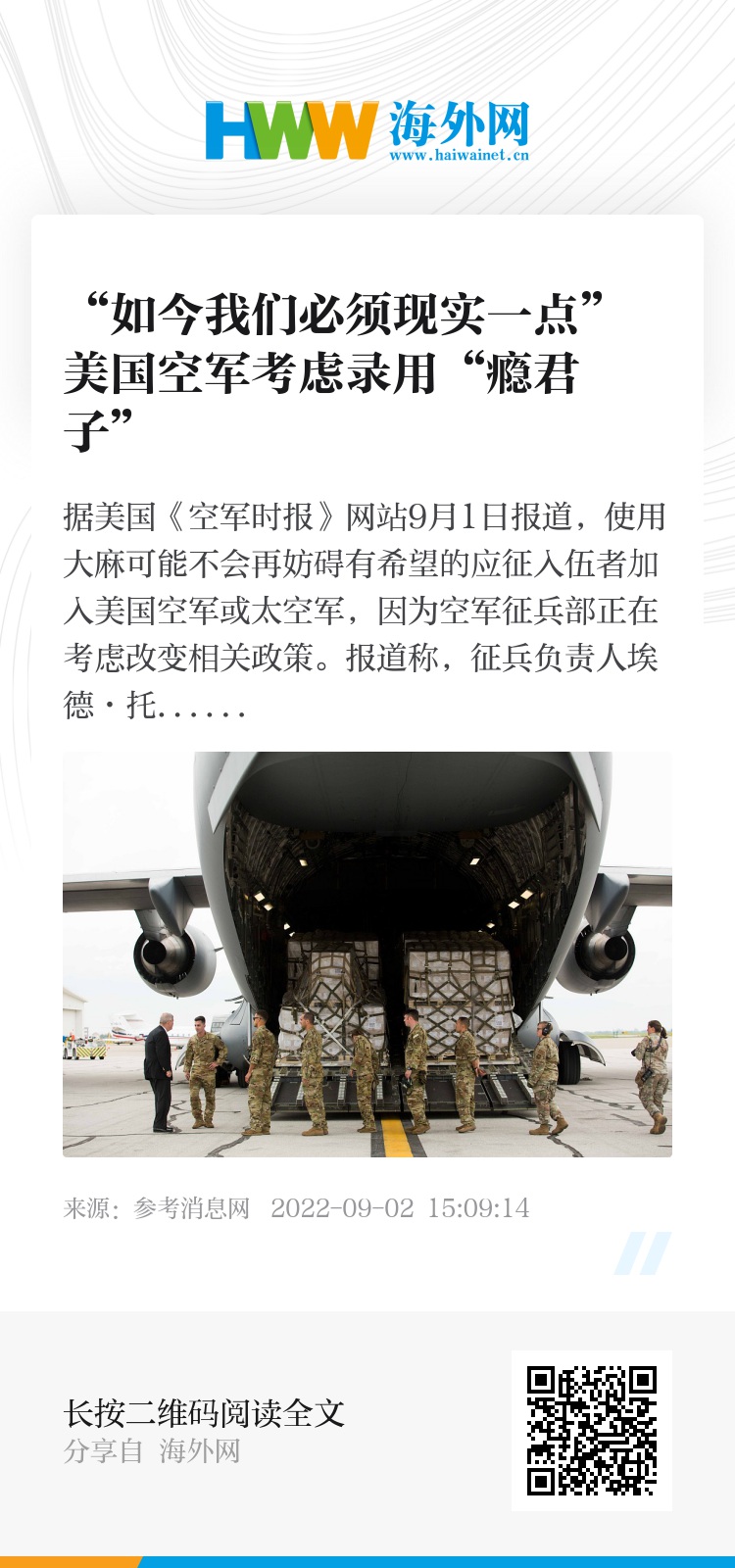 报道称,空军没有回答这项政策何时可能敲定,也没有回答有多少人因四氢大麻酚检测阳性而被刷掉。