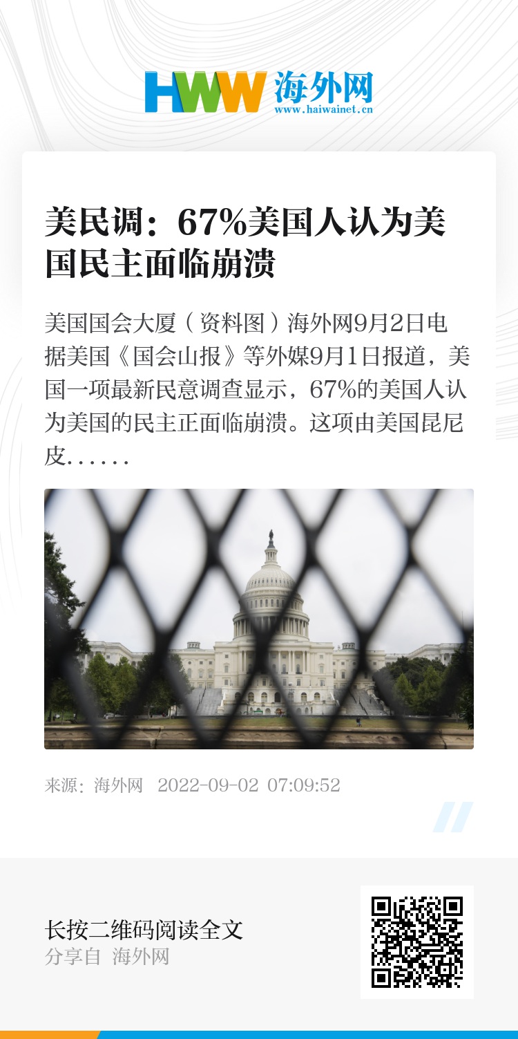 海外网9月2日电 据美国《国会山报》等外媒9月1日报道,美国一项最新民意调查显示,67%的美国人认为美国的民主正面临崩溃。