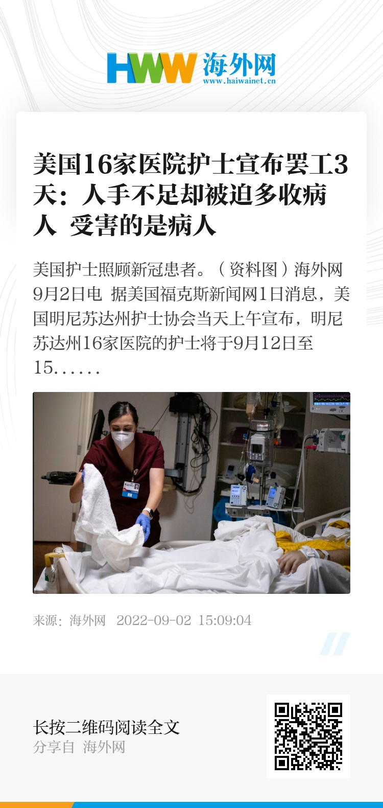 海外网9月2日电 据美国福克斯新闻网1日消息,美国明尼苏达州护士协会当天上午宣布,明尼苏达州16家医院的护士将于9月12日至15日罢工。自3月以来,护士们一直在与医院方进行谈判,并称护士短缺已演变成一场危机,“护士不足的情况下还要多收治病人,受害的将是病人。”