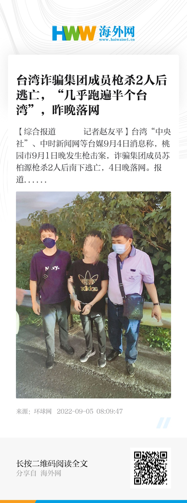 【环球网综合报道 记者赵友平】台湾“中央社”、中时新闻网等台媒9月4日消息称,桃园市9月1日晚发生枪击案,诈骗集团成员苏柏源枪杀2人后南下逃亡,4日晚落网。报道称,苏柏源不到3天几乎跑遍半个台湾。