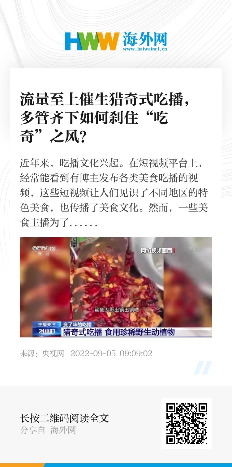 近年来,吃播文化兴起。在短视频平台上,经常能看到有博主发布各类美食吃播的视频,这些短视频让人们见识了不同地区的特色美食,也传播了美食文化。然而,一些美食主播为了吸引点击量,竟然触碰法律红线,发布猎奇式吃播。
