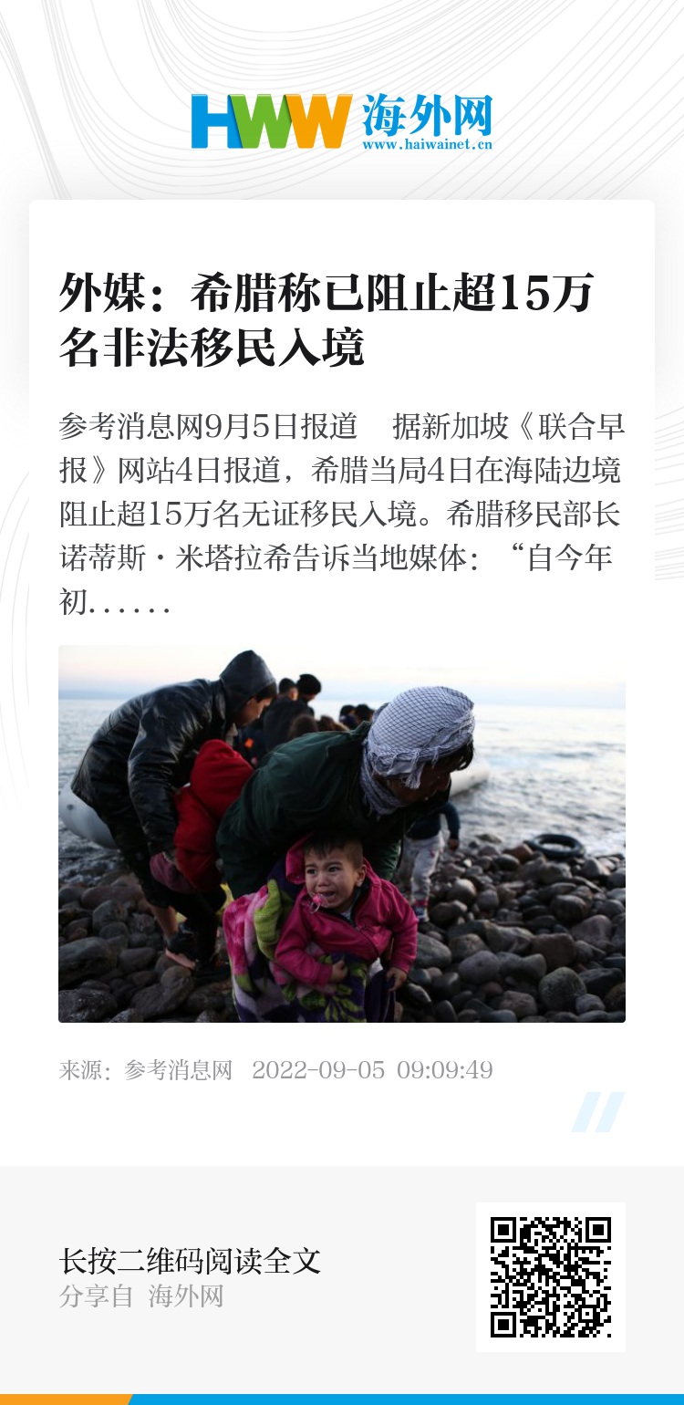 参考消息网9月5日报道 据新加坡《联合早报》网站4日报道,希腊当局4日在海陆边境阻止超15万名无证移民入境。