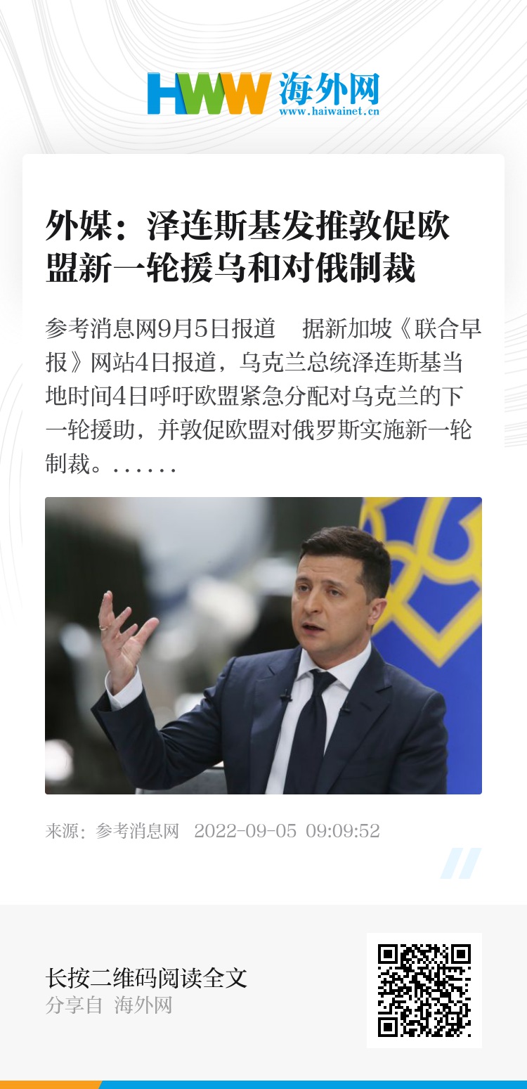 参考消息网9月5日报道 据新加坡《联合早报》网站4日报道,乌克兰总统泽连斯基当地时间4日呼吁欧盟紧急分配对乌克兰的下一轮援助,并敦促欧盟对俄罗斯实施新一轮制裁。