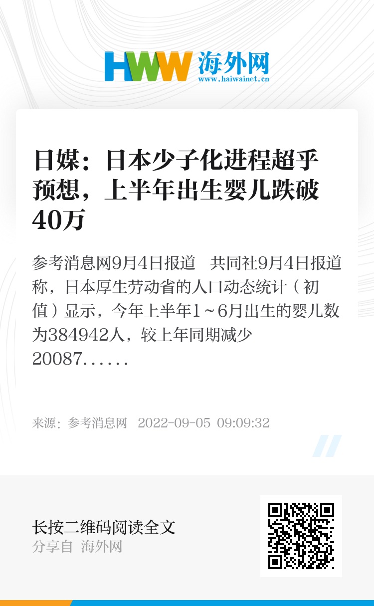 参考消息网9月4日报道 共同社9月4日报道称,日本厚生劳动省的人口动态统计(初值)显示,今年上半年1~6月出生的婴儿数为384942人,较上年同期减少20087人(减少5.0%)。据该省透露,上半年跌破40万为2000年以来首次。有分析认为,受新冠疫情长期化影响,一些人因为担心感染等而避免怀孕。