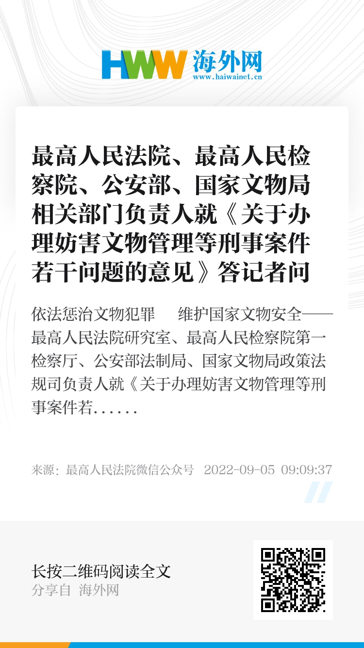 9月5日,最高人民法院、最高人民检察院、公安部、国家文物局联合发布《关于办理妨害文物管理等刑事案件若干问题的意见》(公通字〔2022〕18号,以下简称《意见》)。为便于司法实践准确理解与适用,最高人民法院研究室、最高人民检察院第一检察厅、公安部法制局、国家文物局政策法规司有关负责人接受了采访。