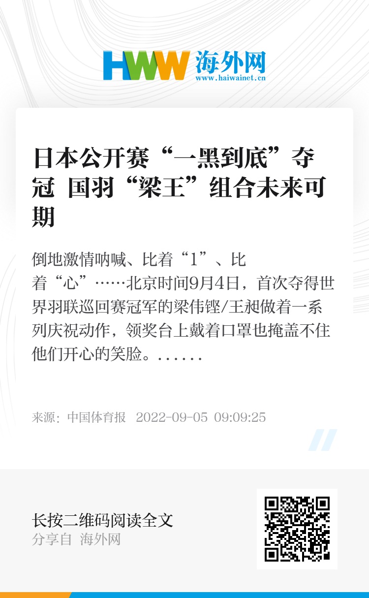 倒地激情呐喊、比着“1”、比着“心”……北京时间9月4日,首次夺得世界羽联巡回赛冠军的梁伟铿/王昶做着一系列庆祝动作,领奖台上戴着口罩也掩盖不住他们开心的笑脸。从今年5月搭档参加比赛以来,两位“00后”小将不断实现个人突破,“梁王”组合未来可期。