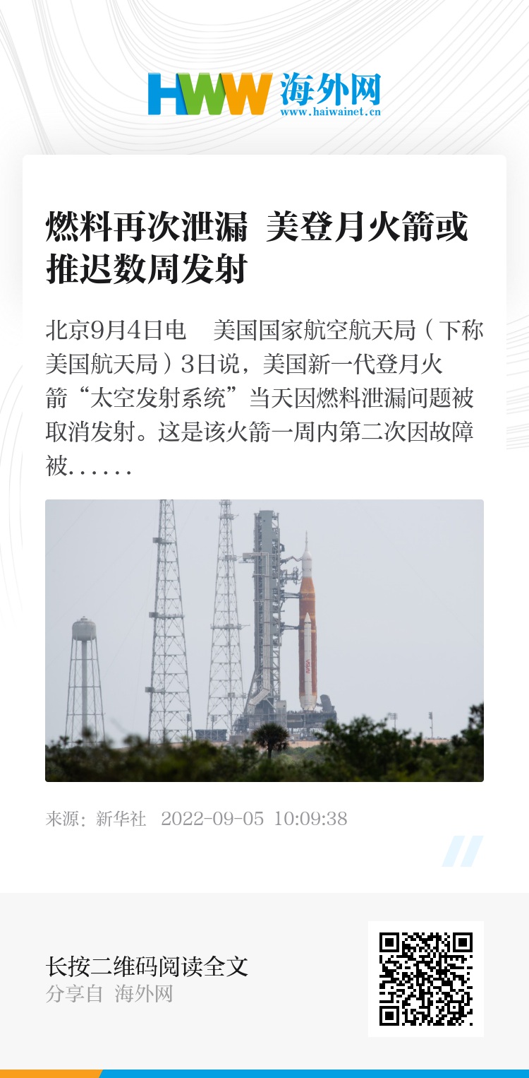 新华社北京9月4日电 美国国家航空航天局(下称美国航天局)3日说,美国新一代登月火箭“太空发射系统”当天因燃料泄漏问题被取消发射。这是该火箭一周内第二次因故障被取消发射,下次尝试发射最早要等到10月中旬。