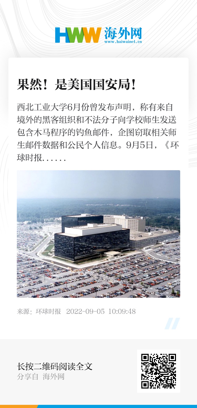 西北工业大学6月份曾发布声明,称有来自境外的黑客组织和不法分子向学校师生发送包含木马程序的钓鱼邮件,企图窃取相关师生邮件数据和公民个人信息。9月5日,《环球时报》从相关部门获悉,“西北工业大学遭受境外网络攻击”的“真凶”是美国国家安全局(NSA)特定入侵行动办公室(TAO)。在各部门的通力协作下,此次行动全面还原了数年间美国NSA利用网络武器发起的一系列攻击行为,打破了一直以来美国对我国的“单向透明”优势。