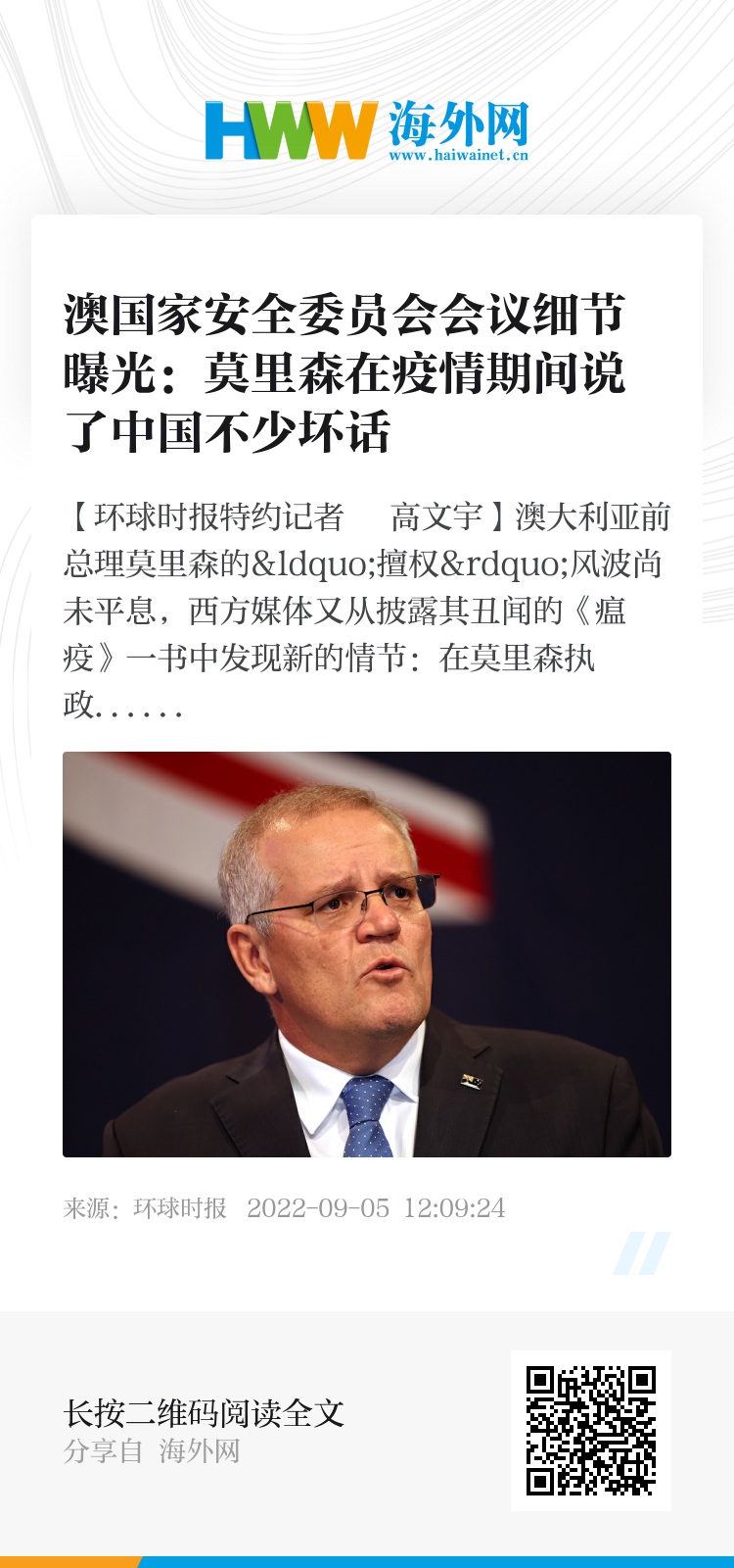 【环球时报特约记者 高文宇】澳大利亚前总理莫里森的“擅权”风波尚未平息,西方媒体又从披露其丑闻的《瘟疫》一书中发现新的情节:在莫里森执政期间,澳大利亚国家安全最高决策机构违规对外泄露国家机密、大搞双重标准;不仅如此,莫里森还在疫情期间罔顾事实,说了中国不少坏话。更为讽刺的是,这些最新爆料很有可能是莫里森自己主动提供给爆料人的。