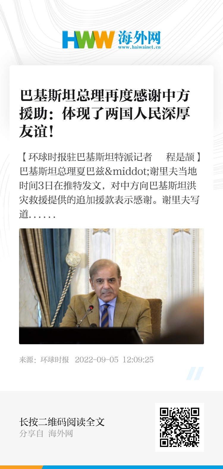 8月30日,谢里夫已经向中方表达了一次感谢。他在巴首都伊斯兰堡总理府举行的记者会上说,巴方感谢中国为巴提供抗洪救灾援助物资。