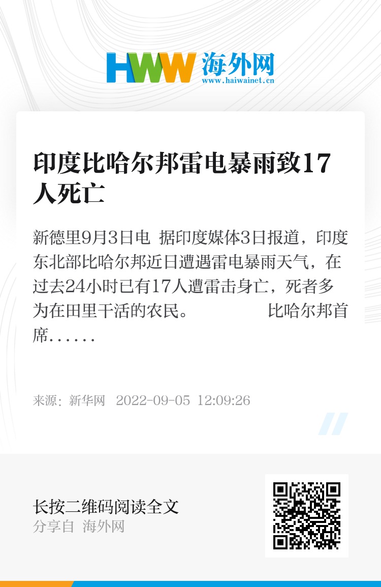 新华社新德里9月3日电 据印度媒体3日报道,印度东北部比哈尔邦近日遭遇雷电暴雨天气,在过去24小时已有17人遭雷击身亡,死者多为在田里干活的农民。