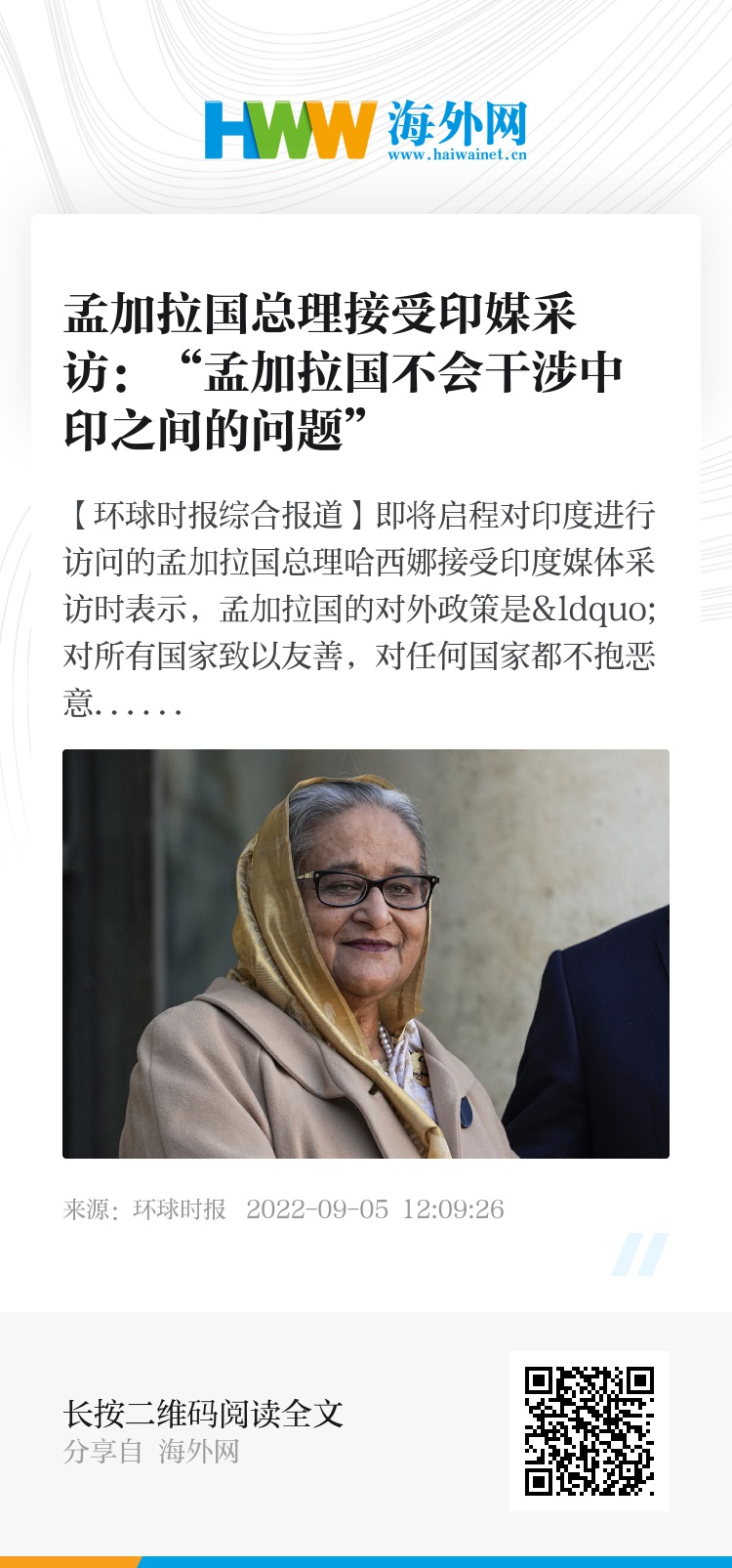 【环球时报综合报道】即将启程对印度进行访问的孟加拉国总理哈西娜接受印度媒体采访时表示,孟加拉国的对外政策是“对所有国家致以友善,对任何国家都不抱恶意”,强调不会干涉印中两国之间的事务。