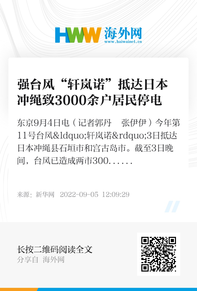新华社东京9月4日电(记者郭丹 张伊伊)今年第11号台风“轩岚诺”3日抵达日本冲绳县石垣市和宫古岛市。截至3日晚间,台风已造成两市3000余户居民停电,冲绳县那霸市1名女性受轻伤。