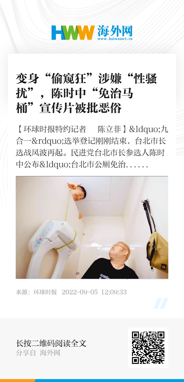 【环球时报特约记者 陈立非】“九合一”选举登记刚刚结束,台北市长选战风波再起。民进党台北市长参选人陈时中公布“台北市公厕免治马桶”政见(“免治马桶”就是可冲洗马桶,台湾翻译成“免治马桶”是取“免痔”同音,因为这种马桶的发明是针对患有痔疮的人),宣传影片却出现类似韩国电影《熔炉》的厕所偷窥桥段,在岛内引起性骚扰争议。