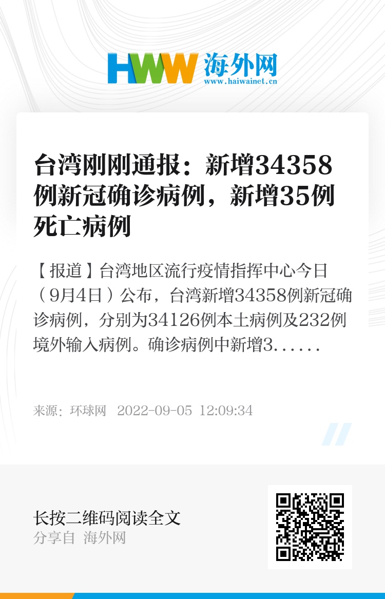 【环球网报道】台湾地区流行疫情指挥中心今日(9月4日)公布,台湾新增34358例新冠确诊病例,分别为34126例本土病例及232例境外输入病例。确诊病例中新增35例死亡病例。