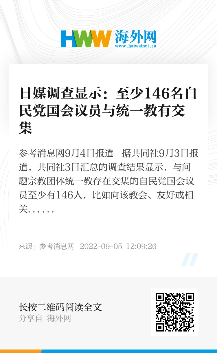 参考消息网9月4日报道 据共同社9月3日报道,共同社3日汇总的调查结果显示,与问题宗教团体统一教存在交集的自民党国会议员至少有146人,比如向该教会、友好或相关团体的活动发贺电等。该人数相当于381名自民党所属国会议员的38%,再次凸显两者联系较深。也有许多议员未接受采访,近期将公布的该党调查结果中,人数可能进一步增加。
