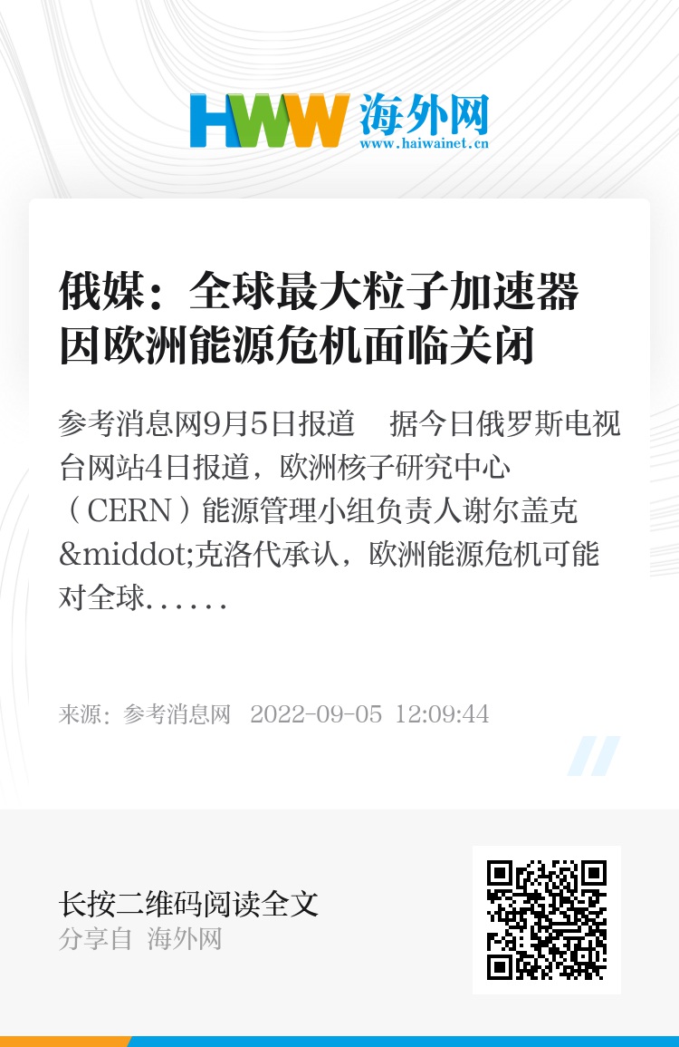 参考消息网9月5日报道 据今日俄罗斯电视台网站4日报道,欧洲核子研究中心(CERN)能源管理小组负责人谢尔盖克·克洛代承认,欧洲能源危机可能对全球最大粒子加速器——大型强子对撞机(LHC)造成影响。