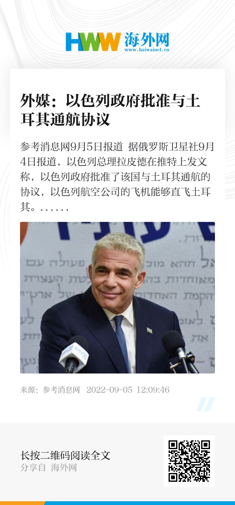 参考消息网9月5日报道 据俄罗斯卫星社9月4日报道,以色列总理拉皮德在推特上发文称,以色列政府批准了该国与土耳其通航的协议,以色列航空公司的飞机能够直飞土耳其。
