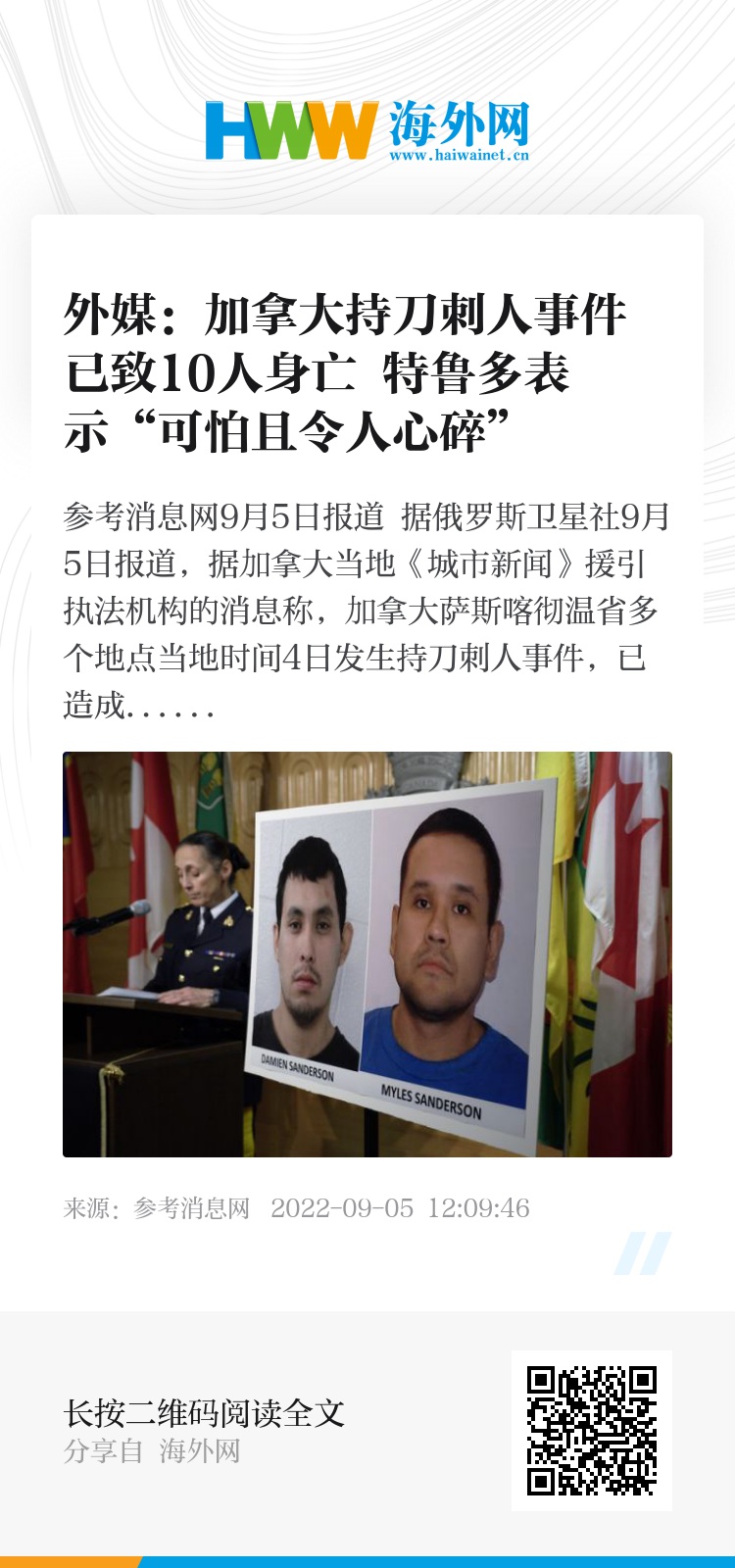 另据法新社报道,加拿大总理特鲁多在推特上写道,4日发生在萨斯喀彻温省的持刀伤人事件“可怕且令人心碎”。