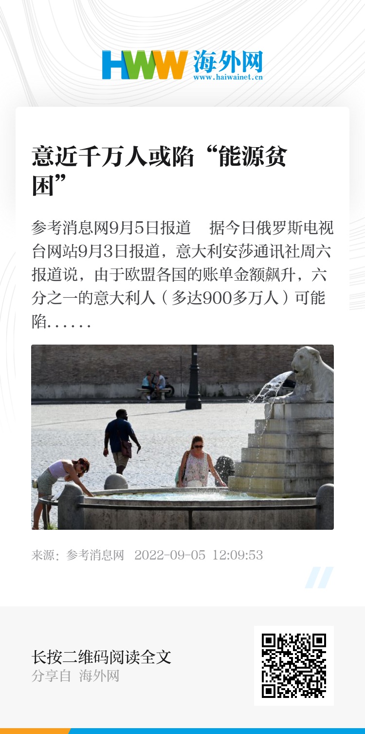 参考消息网9月5日报道 据今日俄罗斯电视台网站9月3日报道,意大利安莎通讯社周六报道说,由于欧盟各国的账单金额飙升,六分之一的意大利人(多达900多万人)可能陷入能源贫困。