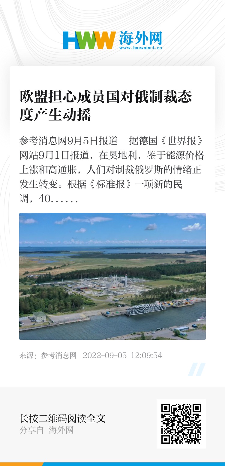 参考消息网9月5日报道 据德国《世界报》网站9月1日报道,在奥地利,鉴于能源价格上涨和高通胀,人们对制裁俄罗斯的情绪正发生转变。根据《标准报》一项新的民调,40%的奥地利人倾向于(18%)或完全(22%)反对因俄乌冲突而继续实施对俄罗斯的制裁。当前,只有46%的人支持惩罚措施。