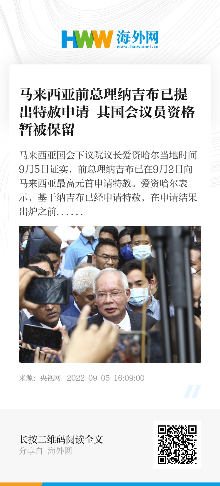 马来西亚国会下议院议长爱资哈尔当地时间9月5日证实,前总理纳吉布已在9月2日向马来西亚最高元首申请特赦。