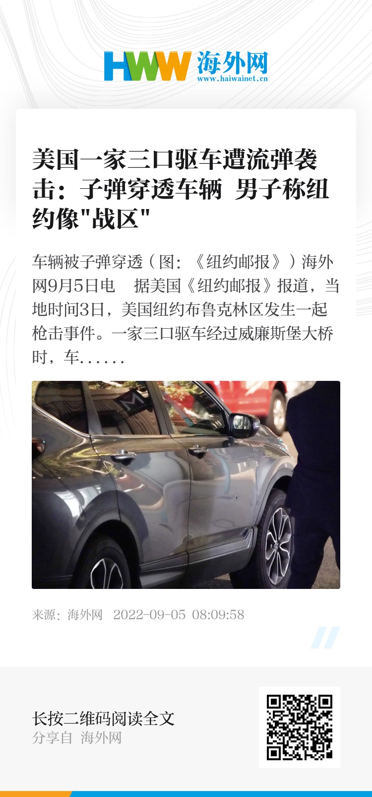 海外网9月5日电 据美国《纽约邮报》报道,当地时间3日,美国纽约布鲁克林区发生一起枪击事件。一家三口驱车经过威廉斯堡大桥时,车辆遭流弹穿透,一名女子脖子受伤。