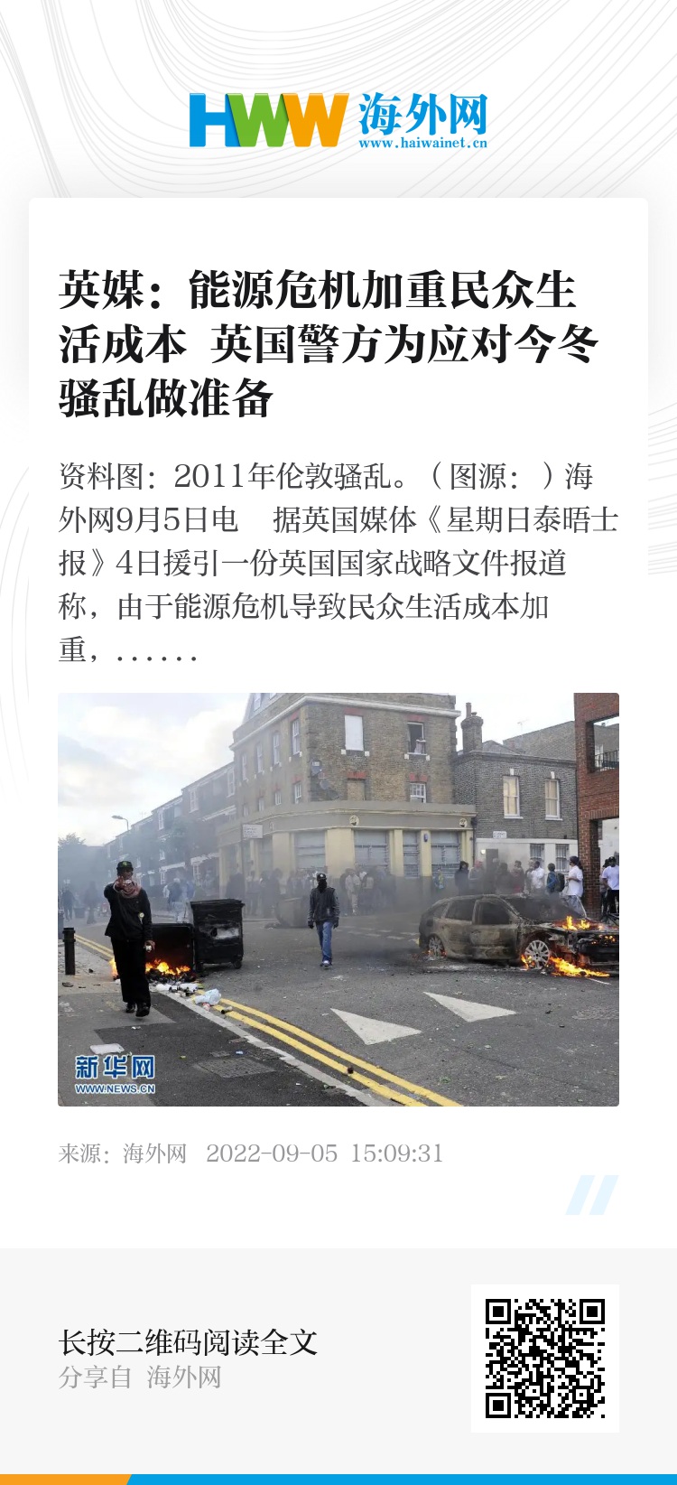 这份由英国警察局长们编制的文件警告说,经济动荡和金融不稳定可能导致入店行窃、入室盗窃、车辆偷盗、网络欺诈和勒索等犯罪行为增加。更多的儿童可能会加入贩毒团伙,更多的妇女可能会受到侵害。同时,这份报告也警告,警察本身也可能受到危机影响,“尤其是那些陷入重大债务或财务困难的警员,他们更有可能出现腐败行为”。报告表示,“长期而痛苦的经济压力”可能会导致更大骚乱的风险,这些骚乱规模可能类似于2011年的伦敦骚乱。目前,英国警方正在编制应急计划,以应对生活成本加重可能产生的影响。