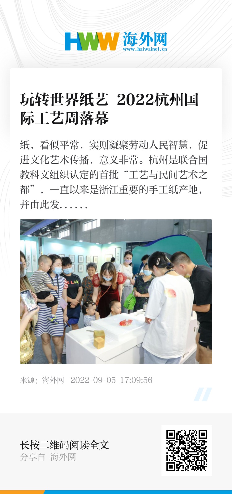 2022年8月18日至22日,2022杭州国际工艺周在杭州创意设计中心举行。本届杭州国际工艺周以“不‘纸’于此”为主题,整个展区分为“纸在千年”、“纸在明日”、“纸在世界”、“神奇动物在这里”四个部分。从《千里江山图》中汲取灵感,展区设计充分体现南宋风韵,并以手工艺为载体,传达“宋韵文化”和“亚运文化”。