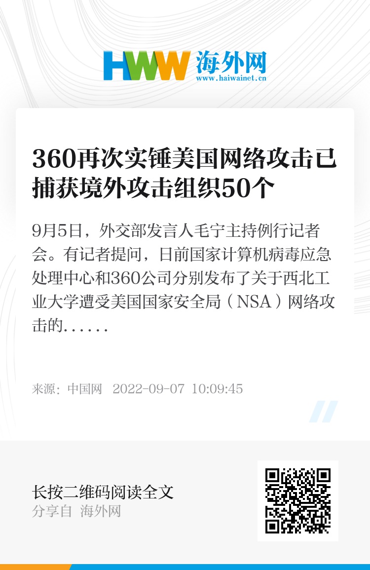 9月5日,外交部发言人毛宁主持例行记者会。有记者提问,日前国家计算机病毒应急处理中心和360公司分别发布了关于西北工业大学遭受美国国家安全局(NSA)网络攻击的调查报告,显示美国国家安全局下属的特定入侵行动办公室(TAO)针对中国的网络目标实施了上万次的恶意网络攻击。请问中方对此有何评论?