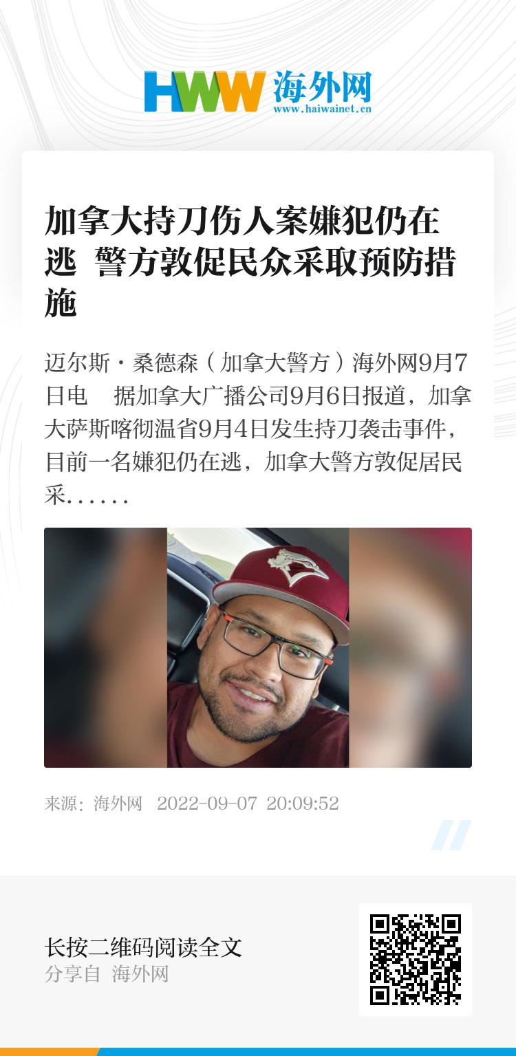 海外网9月7日电 据加拿大广播公司9月6日报道,加拿大萨斯喀彻温省9月4日发生持刀袭击事件,目前一名嫌犯仍在逃,加拿大警方敦促居民采取预防措施。