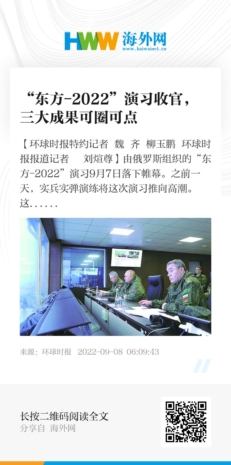 【环球时报特约记者 魏 齐 柳玉鹏 环球时报报道记者 刘煊尊】由俄罗斯组织的“东方-2022”演习9月7日落下帷幕。之前一天,实兵实弹演练将这次演习推向高潮。这次演习,是中国军队第四次派部队参加俄军年度战略演习,也是首次同时派出陆海空三军参加联演。各项演练课目体现出中国军队练兵备战水平,彰显了国防和军队改革成果,表明了中国军人捍卫和平的强大能力和坚定决心。