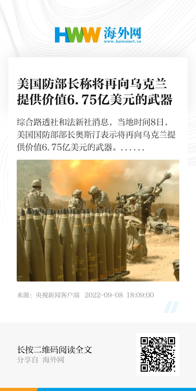 综合路透社和法新社消息,当地时间8日,美国国防部部长奥斯汀表示将再向乌克兰提供价值6.75亿美元的武器。